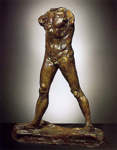 Maubert also mentions that after Giacometti’s death, in his library there was a book on Etruscan art on which Giacometti had drawn on a map a series of walking figures going from Etruria to Switzerland. Egyptian art also offers many walking figures. During his Italian visits Giacometti was also drawn, particularly in his younger periods, to Tintoretto, for his severe perspectives and distorting views. From here one has to jump and inevitably ponder on Rodin. When Giacometti was in his teens he was fascinated by a book on the French sculpture which he encountered in 1915 – Rodin was still alive; he died in 1917--, but the two artists produced and thought out their creations very differently. Rodin worked with volume, Giacometti with space. Rodin’s walking man – with or without head – are very different conceptions.
