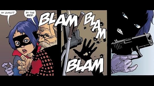 Lemire has NYC-girl Hit-Girl as foul-mouthed New Yorker and super violent "super-hero" crime fighter. Lemire goes all Garth Ennis on us, with grotesque bloody killing of drug traffickers throughout. That combo of humor and violence is familiar to comics, a kind of crazy Preacher or The Boys edge, but it's a girl. Is that funny? I guess.