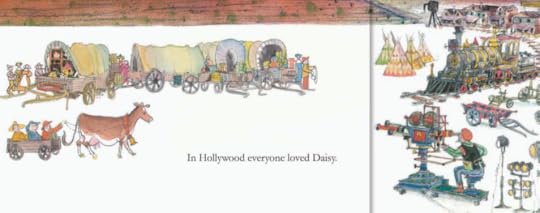 This children's book has gorgeous illustrations, and is about Daisy, the cow, who wants to see the world. Her owner rents her to a Hollywood studio. At first Daisy loves being in films, but then grows very homesick for her fields and food. She really doesn't see much of the world, but finds "there's no place like home".