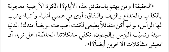 يبدو أن لا شيء يتغير عبر الأيام بل عبر التاريخ كله، الإنسان كائن بائس! *** العيش مهمة صعبة. *** العالم كله مريض مرضًا مزمنا لا علاج له، لا يوجد شفاء. *** من الجيد ألّا يحتاج المرء شيئًا، أي شيء. *** هل ثمّة شيء يلمع في الوادي السحيق؟ هل ثمّة نور ولو ضئيل يقاوم الظلام الشرس المهيمن على الأشياء كلها؟ *** هل يحق لك أو لأي أحد آخر محاسبة غيره من الناس وبقسوة؟ هل يحق للناس أصلًا محاسبة بعضهم البعض؟ *** الإرادات، اللامصادفات، الحقائق المراوغة، الآلهة المختَرعة، الأكاذيب المقلوبة، النفوس المريضة، الأرواح المعذبة، التاريخ كسيرورة محتومة تنتهي من حيث بدأت، الزمن كدائرة مغلقة، هل ذلك كله بلا معنى؟!