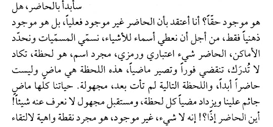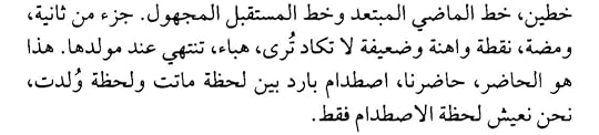 “الزمن كله افتراضي، أحجية لا تأثير لنا فيها. يمضي ويحضر ويسير إلى المستقبل من دون أن يلتفت لإرادتنا في استرجاع أو وقف أي لحظة منه”.