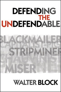I would like to see Block defend the elements of the government he respects, possibly the provision of public goods, of courts, and of defensive military action (imagine a section ‘The Tax Man’ or ‘The Murderous General’). Only then would he be defending the truly indefensible. While the eclectic selection makes for an interesting (though misspelled) conceit, Block is apparently, though not really, a contradictor rather than a reasoning man with strong principles. I would like to see him remedy this by eviscerating the culturally despised people he also despises, presumably the rent-seeking corporation such as the warmonger or the monopolist, the bribe-taking politician, the thief, the murderer, the rapist, the contract-breacher, the liar, and the confidence man.