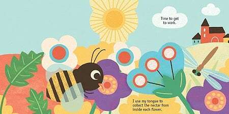This book has the reader take a journey with a little bee as is discovers flowers, collects nectar, heads back to the hive, and tours the hive. It features bright cheerful illustrations with interesting cutouts and page shapes.