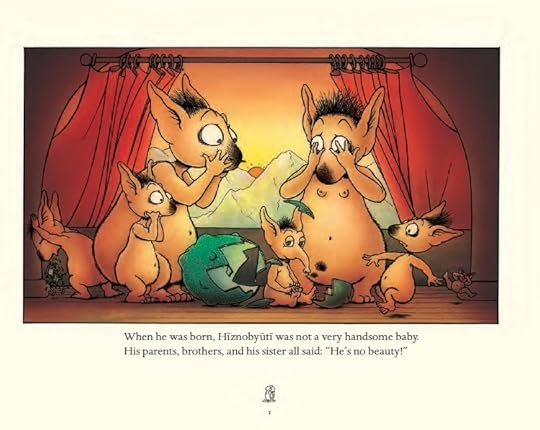 But to the book... This book was kind of sad. This little creature's entire family calls him ugly basically. They say "He's no beauty" so much he thinks his name is Hiznobyuti. It's so sad. They are all mean and rude to him and he's sad. Honestly, it made me really upset.