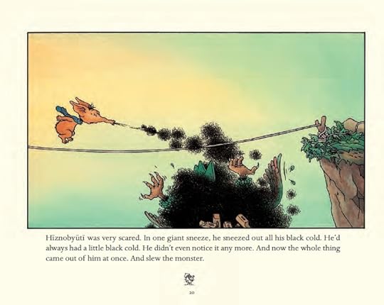 I noticed one peculiarity in this book that seemed distinctively different from the American children's books we read: the creatures are naked, and Hiznobyuti's mother is depicted with breasts. I could be reading into nothing, but I can't think of a single American picture book with naked anthropomorphized characters with noticeable breasts. I appreciated the naturalization, i.e. non-sexualization, of the body.