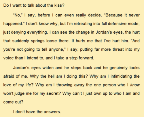 But even then, this book still wouldn’t be it from the page or so I read out of different scene’s at the end. In the one scene I want to mention, the main character said that the other main character was a coward for not coming out to people. Haha, yeah, we’re not going to pressure people to come out for any reason in this house. It’s totally fine to write about a character who says that though, because there are gay people who do, but I leave that here because I am not okay with it and I know some people may be triggered by it or be uncomfortable reading it.