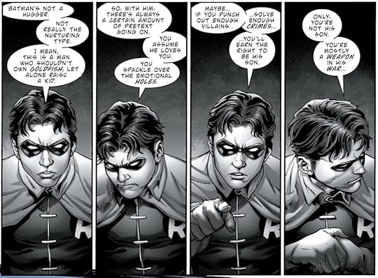 Bawiło mnie tu wiele rzeczy, a już na pewno takich, które nie powinny. W końcu chodzi tu o Damiana i rozumiem, co mógł czuć Bruce, który nieco rozpaczliwie próbuje poznać prawdę i oby była to prawda, że jego syn JEST NAPRAWDĘ JEGO. Z kolei Damian... stanowczo za mało go tutaj, a jak już jest to podejmuje "niemądre" decyzje. Na początku przyjmuje domniemaną prawdę objawioną za pewnik i klęka przed "nowym" ojcem w pokazie szacunku, tak szybko zapominając o starym tatku, który do tej pory tyle dlań poświęcił... Serio?
