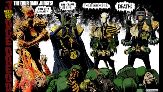 Why isn’t this book a total fail? Greg Capullo’s art. The only benefit to Snyder’s batshit script is the uniquely weird stuff Capullo gets to draw (none of which has any bearing on the plot) like Joker dragons, zombie Robins (who all say “Crow” because birds and subversion?), and a Justice League-themed Megazord! Barbatos looked so damn cool as did the giant Hawkman avatar and the numerous incarnations of Batman, though really I found most pages to look impressive. The Batman Who Laughs’ design though looks like a complete rip-off of Dredd’s Judge Death.