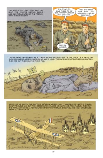 Notes on content [based on the ARC]: About 10-15 minor swear words. There are two instances where sexual activity is implied but it happens under a blanket or in a dark room and isn’t shown. (One is a married couple, the other isn’t.) There are several butt scenes (one set hazing an officer, one set swimming and the guys meet some women while the guys are naked, and another set when soldiers get the runs). Very realistic and graphic war violence shown on page including blood, guts, severed limbs, etc., etc. The death count is also super high, as is accurate for WWI. Smoking and drinking alcohol are engaged in as was the custom of the time period.