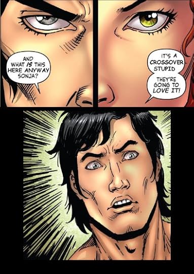Well, they can, and the explanation that is given is as fantastic and magical as it is credible (at least to Sonja's realm or what I know about it as of yet). The two of them are even able to switch back and forth to fight their enemies in their respective eras!, and that involves a prop from another character, who you probably all know (even without reading comic books). Apropos fighting. There's quite a lot of it in this volume, and it's not always the good vs the evil. Sonja and Tarzan were actually off to a rough start that began like this, and continued for seven long pages!