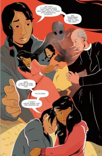 I thought the art work was simple and effective, as well as the text. This is a rather sad GN since it deals with a horrible reality of First Nations and Native American life, that of disappearing young women - killed, trafficked etc. It highlights aspects of Native American culture/life - dances, and customs - which are treated respectfully, as part of a cohesive nurturing community. Set against the community is the looming danger of group homes for Indian children - which are likened to Canadian residential schools of the past, when the Canadian government would remove children from Indian families so they could be sent away and educated at residential schools, and therein be inculcated according to "mainstream" ideas, losing their Native languages, customs, religion, and traditions. The tragic legacy of the European in Canada with respect to the Indians seeps through every page.