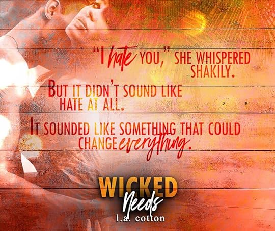 L.A. Cotton was a new to me author, but not anymore. When I stated I binge read the first four books, I did so in about a three and a half day period. I couldn’t and wouldn’t put them down and that same enthusiasm transferred to Wicked Needs as well. Wicked Needs is one of the best YA/NA romances I have read this year, and believe me I have read a bunch of them. I can’t wait for the next book and am already wanting to ask when will it be out because I am that excited about it. Like I stated before check out Wicked Needs as well as the previous books, I think you will be as hooked on them as I am.