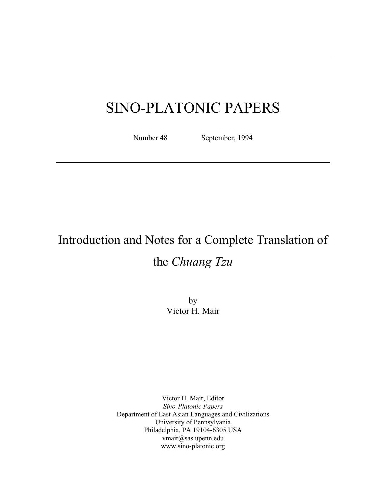 My complete translation of the Chuang Tzu was published by Bantam Books in the late summer of 1994. Because of the nature of that publication, it was impossible for me to include all of the notes and commentary that I had prepared during the course of my work on the text. As with my edition of the Tao Te Ching (Bantam, 1990), however, I promised in the Chuang Tzu (p. liv) that I would issue in Sino-Platonic Papers a separate set of materials designed for those individuals who would like more detailed information on specific points. That is the genesis of this particular volume.