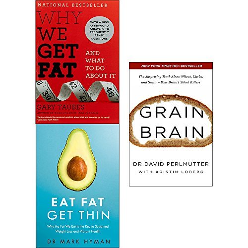 Why we get fat, eat fat get thin and grain brain 3 books collection set. Why We Get And What to Do about It Building upon his critical work in Good Calories, Bad Calories and presenting fresh evidence for his claim, Gary Taubes revisits the urgent question of what’s making us fat—and how we can change. He reveals the bad nutritional science of the last century—none more damaging or misguided than the “calories-in, calories-out” model of why we get fat—and the good science that has been ignored. He also answers the most persistent Why are some people thin and others fat? What roles do exercise and genetics play in our weight? What foods should we eat, and what foods should we avoid? Persuasive, straightforward, and practical, Why We Get Fat is an essential guide to nutrition and weight management. Eat Fat Get Why the Fat We Eat Is the Key to Sustained Weight Loss and Vibrant Health For decades we've been told that the fat we eat turns to fat in the body, contributing to weight gain, heart disease, diabetes, and generally poor health. And yet, even with all our low-fat products, we're fatter and sicker than ever before. What's going on? Could it be that the most feared food group is actually...the most helpful? Grain The Surprising Truth about Wheat, Carbs, and Sugar - Your Brain's Silent Killers Dr Perlmutter explains what happens when the brain encounters common ingredients in your daily bread and fruit bowls, why your brain thrives on fat and cholesterol, and how you can spur the growth of new brain cells at any age. He offers an in-depth look at how we can take control of our 'smart genes' through specific dietary choices and lifestyle habits, demonstrating how to remedy our most feared maladies without drugs.