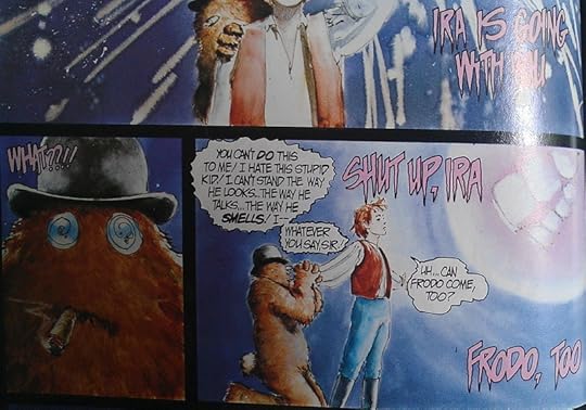 The art is beautiful. Watercolors are haunting and exquisite. The style often adds to the absurd and comical nature of the story. Sometimes Ira's just a giant ball of brown fur in the panel with his cigar permanently attached to his mouth. The king of the mall planet and his wife and their children are brilliantly rendered. The war scenes are gruesome.