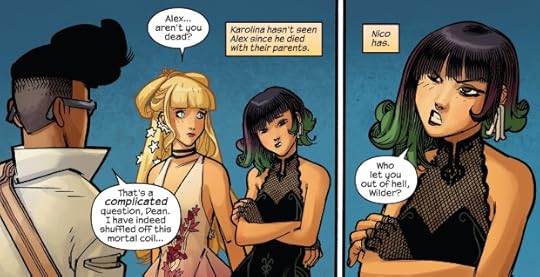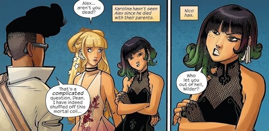 That might in part be due to the huge misstep of returning Alex to the fold (and maybe to life?). I mean, he's a sociopath, and so we don't like him, and we think less of the Runways who try to welcome him back. Meanwhile, Rowell doesn't even try to offer a good reason for his resurrection. So, it just feels like a big-reset button that the comic had moved past.