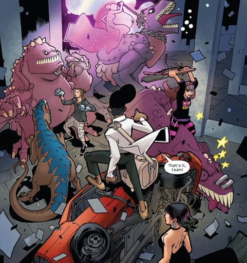 I was tempted to knock off a star or so because David La Fuente's fill-in art is nowhere near as good as Kris Anka or Takeshi Miyazawa (who returns to the Runaways for an adorable side-story from Old Lace's perspective), but fuck it, I'll round up anyway. Runaways forever!