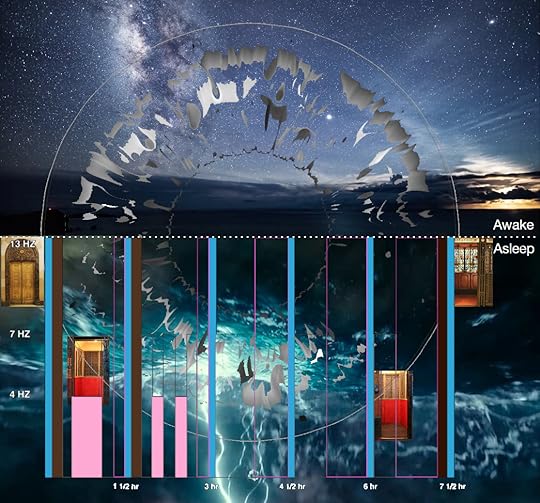 I made this gestalt with the little elevators shuttling the dreamer in an out of various states of a night. The author takes us on a tour through a night with EEG and charts. The trek of the brain descending into the stages of sleep begins by going through the liminal state of hypnagogia. A sleeper naturally flows from the relaxed state of alpha through hypnagogia and down into theta and from there deeper into delta. And then several times a night the sleeper’s brain moves to the top of the frequency range, alpha, and undergoes a micro-awakening at the end of each of the 5 major sleep cycles. Then back into dreams and slower rhythms without passing through hypnagogia each time. This is the story of the nights brain activity in a universal progression as seen from recorded brain waves. While the alpha beta theta and delta waves are coherent the waves of hypnagogia a liminal state, and REM are chaotic. The hip author uses a folksy metaphor to explain: “During hypnagogic sleep, your brainwaves jump around as they switch gears and slow down.”