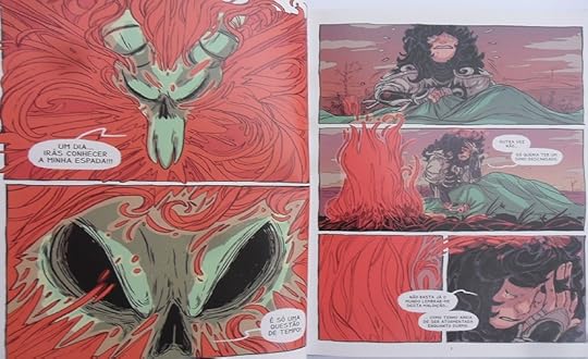 »»» Nota final (Capa e outras considerações): --- [Capa] – A capa é, para mim, o elo fraco desta obra. Capas vendem livros e esta fica bem aquém do que nos reserva o livro - nem sequer é indicativa do género de história que vamos encontrar. --- [Ilustrações] – As ilustrações são fantásticas. Não sendo um traço clássico, nem “cartoonizado”, é um traço único e inconfundível, que revela mestria e é muito bem conseguido, servindo bem esta excelente obra. ----[Cor] – A palete de cores, ainda que bastante limitada, está à altura do desenho e é particularmente eficaz nos elementos de fogo (o dos archotes nos calabouços está magnífico). ----[Momento] – Este livro saiu quando os livros do tipo banda desenhada não estavam tão na moda. Creio que merecia novo lançamento junto das livrarias (de preferência com nova capa – basta ver a arte interior e sabe-se logo que a autora consegue melhor). Ou até uma nova aventura de Zahna (eu compraria de certeza). ----[Título/nome] – Agora que li, gostava de ter perguntado à autora a razão do nome da nossa heroína, meio arábico numa aventura de pendor medieval-europeu sem elementos desse tipo.