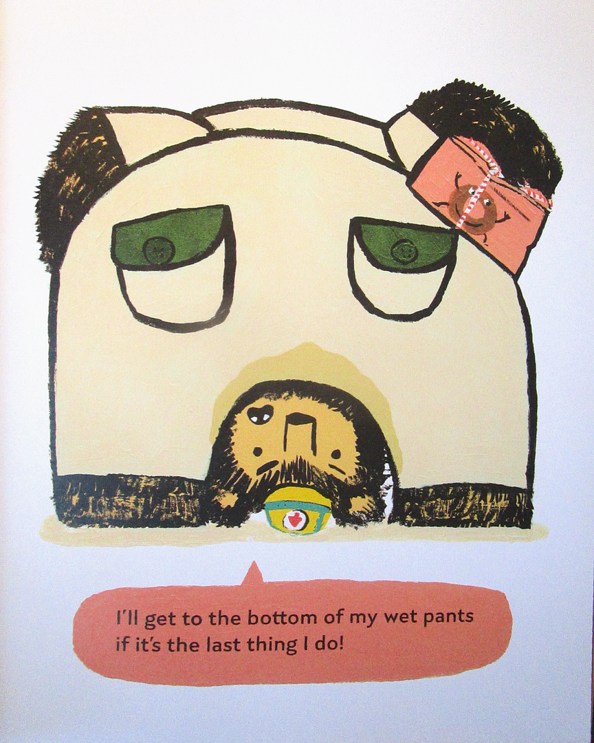 My son found it to be hilarious (and so did I, to a lesser degree), but we are left with an unsolved mystery on our hands. What the hell happened to these damn pants? We flipped through this book over and over trying to pinpoint THE moment they got wet, but to no avail. I am leaning towards the idea that the bear just got sweaty in his butt area. It was a hot day and he walked a lot! (I can personally relate.)