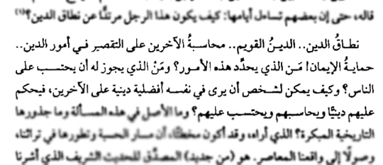 "وهنا تؤكد الشواهد التاريخية من جديد، على أن الانشقاق شيء كامن في طبيعة الجماعات الدينية التي تلعب دوراً سياسياً، لأن استعمال الدين من أجل الدنيا يقود بالضرورة إلى التنازع والفرقة والانشقاق، ولأن زعم امتلاك اليقين هو أول خطوة على طريق التمييز العنصري بين الناس على أساس مُعامل فضفاض لا ينضبط، هو الإيمان."