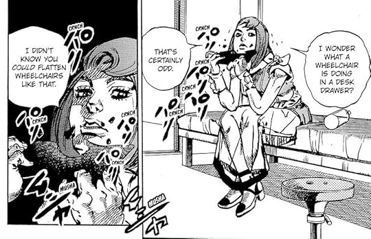 I totally forgot what Jobin's wife looked like, so when we see her in the hospital I was like "Who's this new Higashikata character?" So that was embarrassing when I realized my mistake. But she hasn't been around too frequently until this point anyway.