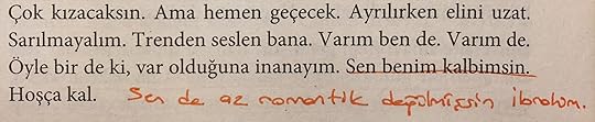 Tam olması gerektiği gibi, benim tercih edeceğim gibi en azından sürdü ve sonlandı kitap; bu kurguya, bu inşaya, bu tekniğe oturan bu olurdu. Tek şikayetim ‘Ebru’ya gerek var mıydı, Ebrusuz da anlamaz mıydık, anlardık, yazar da sadece İbrahim’in çizgisini anlayalım diye Ebru’yu öylesine eklememiş ondan da öğrendiğimiz çok şey var ama ben karakterlerini, hele ‘arayan’ karakterlerini yalnız seven huysuz bir okuyucu olduğum için fln. Ama kitabın başına ‘aşk olmadan ilmin boş olduğunu’ nush eden Fuzuli ile başladığını düşünürsek de biraz canım sıkkın.