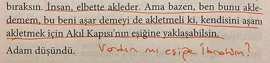 Tüm bunları, kitabın başındayken ne bu seçilmiş kişi meselesi, lekenin olayı nedir, İbrahim nasıl hayatını kaybetmiştir sorularını İbrahim ile birlikte soracaksınız ve anlayacaksınız. Tamam da ‘İbrahim niye mühürlendi’ de diyeceksiniz, kınalı kuzu mudur İbrahim yoksa kara koyun mu, 'süveyda'(°)sını mı arar yoksa, var hepsinin cevabı. Ama bu cevapların hiçbir önemi yok. Konumuz bu değil. {bu ifadeyi çok seven biri olarak Süngü’nin de kullandığını görünce ben bi’ 🫠} {bir de şey var, “daha neler”}