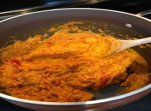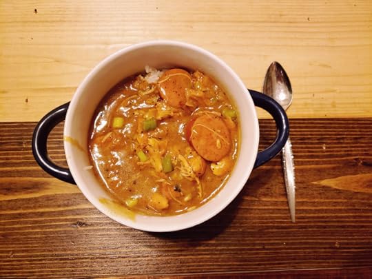 So, like I said, this one starts with a roux (that’s one cup oil to one cup flour, whisked together on medium heat and then stirred every few minutes to prevent burning for 20-30 minutes for those who don’t know) and then a minced version of the “holy trinity” (but with red bell peppers rather than the standard green this go ‘round) added to complete the base . . . .