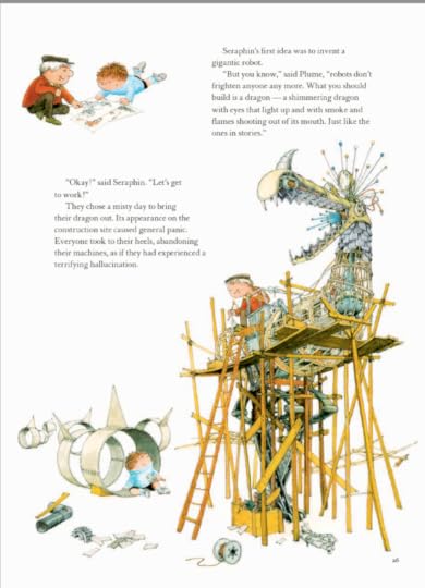 The cover is gorgeous and there are a number of engaging splash pages, but the colorful and often cleverly composed art mostly just serves to emphasize the absence of a compelling story. Our hero, Seraphin, is dreamy and impractical and his experiences become increasingly fantastical and magical as the story progresses. I guess that's fine for a picture book, but this book is crammed with text, and that text is disjointed and never takes us anywhere.