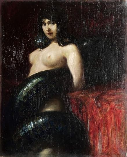 I appreciated this novel for its many artistic references. I especially enjoyed discovering German symbolist Franz von Stuck, who is known for paintings of women with snakes. This image isn't unique in art history. There are other artists who have featured fallen Eve with her coiled seductor, newly ashamed at her nakedness. But von Stuck's women are bold, and show no shame for their sexuality. The phallic serpent may be coiled around her, but it's clear that she 'owns' it.