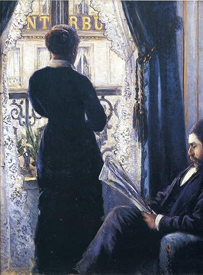 In the Visual Intrigue we are reminded of the Albertian window but of the plays that Caillebotte unfolds with his window paintings. What can be read - not the newspaper the concentrated man holds in front of him - nor the lettering on the facade across the street. And then curtains, in thick velvet and embroidered, and no longer transparent, veil, as well as the window panes and the balcony rail, constitute again obstacles for the lady who is looking at the lady who is looking back at her. Mirror-like then.