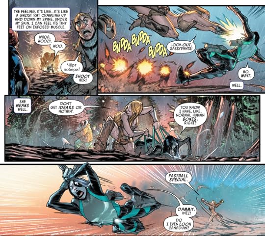 Maybe Simone writing Outlaw. Simone is a master of memorable secondary or minor characters with big doses of personality - King Shark and Ragdoll from Secret Six, Misfit and Barda from Birds, Alysia from Batgirl, and Maizy in Crosswind. Outlaw is one of Simone's best original characters, whom she created in her Deadpool series. Outlaw's a mercenary who leans hard into the cowgirl routine, but it absolutely works for her, as does her fierce BFF love of Domino. Diamondback had a little less of a strong personality but she was still great, and I have no doubt we'll see more of them in the second volume.