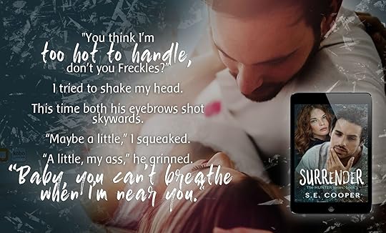 In Surrender, the third novel in the Hunter series, author S.E. Cooper is quick to grab your attention right out of the gate. In introducing us to Kerr Hunter’s past as a soldier, she gives us a glimpse into his broken and battered heart. The pain slays him by day and the memories haunt him by night. He’s careful to keep his walls built up high and locked up tight to keep the demons at bay.