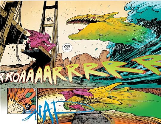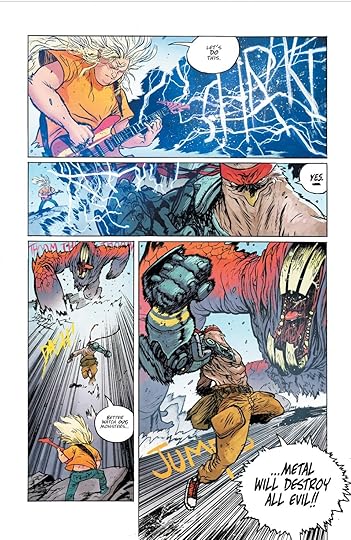Like I said, big monsters, big guitars, big carnage. Everything great about metal music and Godzilla movies is here. There are also a lot of sensitive moments and a big swerve in the middle I didn't see coming. I thought this was going to be a lot of Lobo style over the top shenangians. Don't get me wrong, there are shenanigans but the sensitive moments really elevate this book to another level.