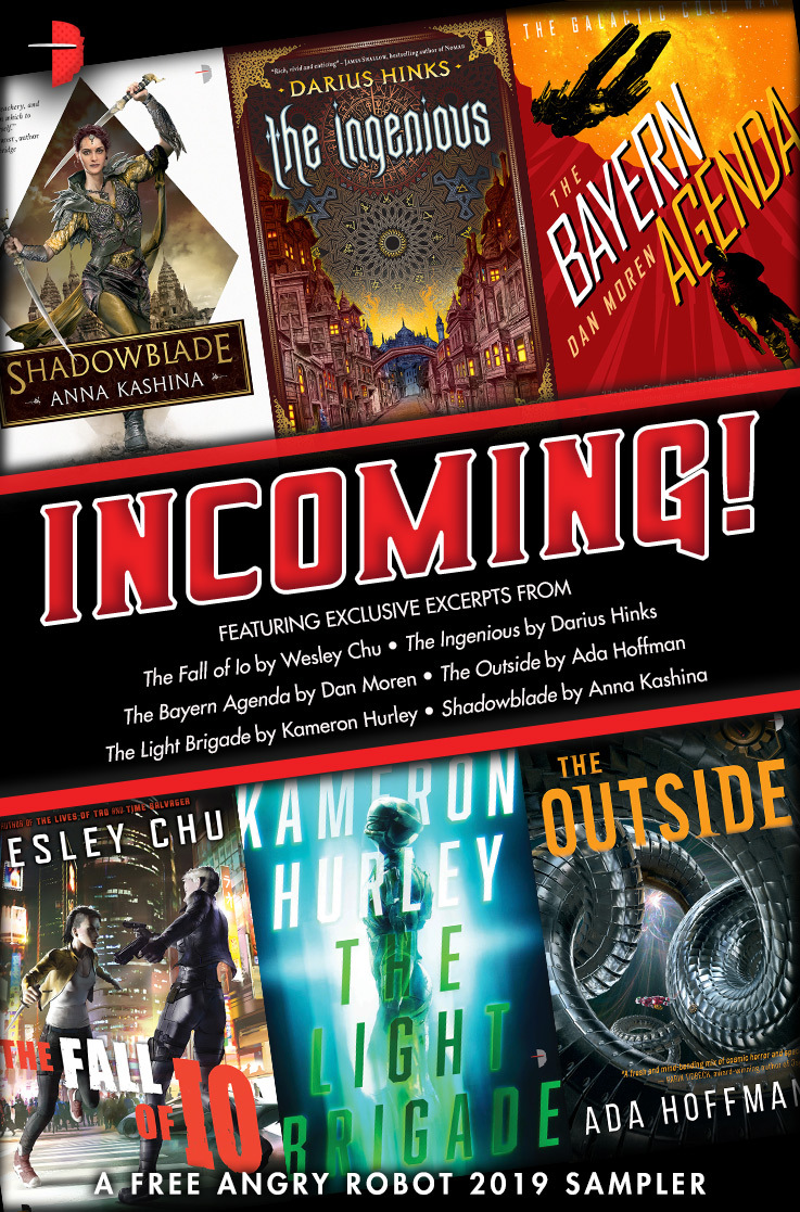 The Fall of Io by Wesley Chu: the superb aliens-in-your-head SF sequel to the wildly popular The Rise of Io, by the author of The Lives of Tao series. The Ingenious by Darius Hinks: the squalid, bloody tale of desperate political exiles seeking a way home from the impossible city that imprisons them. The Bayern Agenda by Dan Moren: a new Cold War threatens the galaxy, in this fast-paced and wisecracking thriller of spies and subterfuge. The Light Brigade by Kameron Hurley: soldiers are broken into light and sent to the frontline of a brutal interplanetary war, in this brilliant military SF from the Hugo Award-winning author of The Stars Are Legion. Shadowblade by Anna Kashina: a young sword prodigy must impersonate a lost princess and throw her life into a deadly political game, in this kinetic epic fantasy novel by the author of the award-winning Majat Code series. The Outside by Ada Hoffman: humanity’s super-intelligent AI gods brutally punish breaches in reality, as one young scientist discovers, in this intense and brilliant space opera.