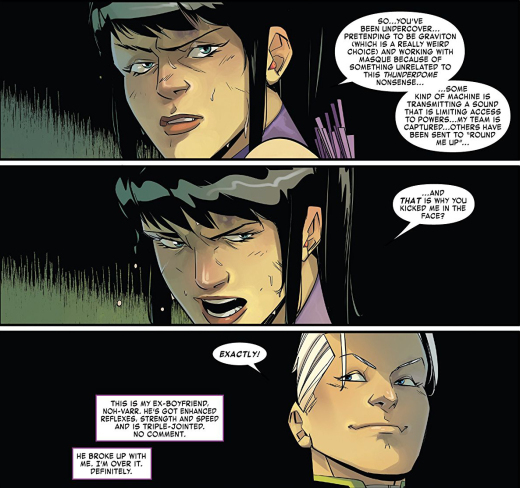 There's a similar flatness to Kate's reaction towards her former flame, Noh-Varr, who you may remember all the way back from Young Avengers. Kate doth protest too much that she's definitely over it (see above image), but why bring up unresolved feelings and then avoid resolution? Even the preview says Kate's relationship with current bf Fuse is "shaky" - but show me one moment in the book that shows them arguing because I couldn't find it!