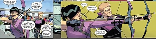 This WCA team is just utterly fantastic. I fell in love with Quentin Quire and Gwenpool, something I never thought I'd be able to say. I even enjoyed Jeff the Landshark. I liked seeing them work together and grow, and I loved seeing Kate coming into her own while Clint took a backseat to let this Hawkeye shine. Clint never felt sidelined or forgotten. On the contrary, he felt like he was truly cheering Kate on and enjoying watching her grow. It was rough and tumble and just so much fun.
