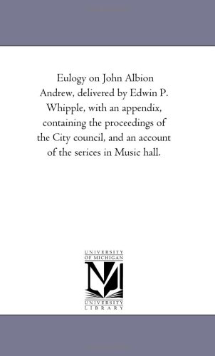Eulogy on John Albion Andrew, delivered by Edwin P. Whipple, with an appendix, containing the proceedings of the City council, and an account of the serices in Music hall.