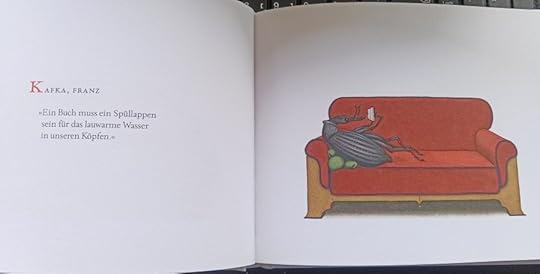 Ein sehr kurzweiliges kleines Büchlein, auf der auf der einen Seite ein Zitat eines berühmten Menschen steht und auf der gegenüberliegenden die Illustration eines Tieres, das lesend auf einer Couch lümmelt. Ich war geneigt, die Zitate für echt zu halten, bis ich zu dieser Doppelseite kam: