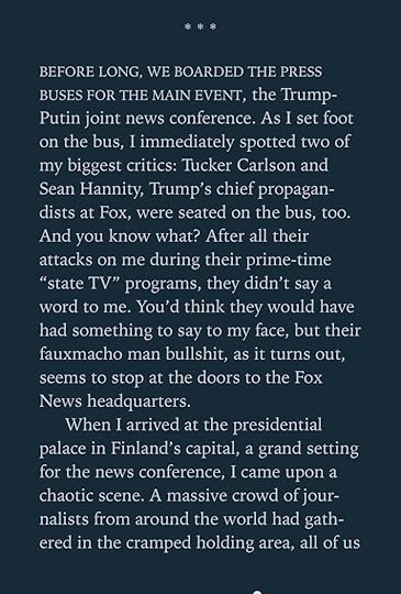 “Every time he [Putin] sees me, he says, ‘I didn’t do that,’ and I really believe that, when he tells me that, he means it,” [T] said to reporters on Air Force One. “I think he is very insulted by it, which is not a good thing for our country.”Jaw drop. Who the eff cares if Putin is insulted??? Putin maybe, his people on his behalf, ... and T (oh...yeah...) This book was published before the latest flipflop love affair with Kim Jong Un...T was bragging to the Puerto Rico governor about being able to use his nuclear football on Kim, and now he's besties? When T was crowing over the body slamming of a journalist by a future congress, um, man, Acosta says