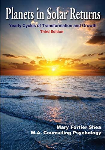 Planets in Solar Returns - Yearly Cycles of Transformation and Growth. Here’s everything you need to know about Solar Returns! Information is based on the author’s experience interpreting hundreds of Solar Return charts for clients. An explanation of the significance of interceptions, retrogrades, aspects, hemispheric or quadrant emphasis, and preponderance or lack of an element or mode in a Solar Return. An interpretation of each planet in every house of a Solar Return. NEW to the 3rd edition! Expanded interpretations of planets in aspects. A guide to “timing” in the Solar Return coordinated with transits, secondary progressions, and solar arcs. A chapter on combining natal charts and Solar Returns in a double wheel technique. Throughout this book, Mary Fortier Shea concentrates on a complete description of possibilities. Interpretations include spiritual transitions, new businesses, love affairs, marriage, issues involving children and parents, health, education, writing and publishing books, relocation, income changes, and career transitions. She covers positive and negative possibilities for different Solar Return placements and configurations.