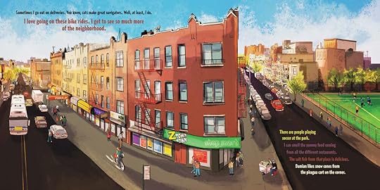 This is a fun read! Both words and text feel vibrant. Our feline narrator is a delight and story does a wonderful job showing the ways in which food and grocery stores can bring people of diverse backgrounds together. Our cat's family runs the bodega (the Spanish word for grocery store, though the author notes they are no longer found just in Hispanic neighborhoods). We see many diverse customers coming for breakfast and lunch, and learn a bit about the inner workings of the bodega. It's great to see family and community celebrated like this. Across the street, another cat's family runs an Asian grocery store and, at the end, the families (and their cats) come together for a meal. The vibrant, busy nature of NYC really comes alive in the illustrations, too.