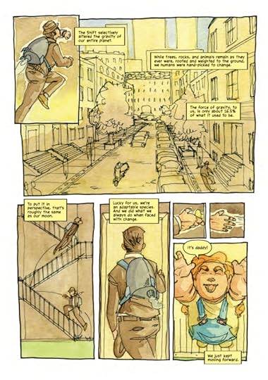 This is a fantastic parable about how a global catastrophe is felt on the most personal of levels. Across the world, the force of gravity begins to work less on humans and humans alone, and what at first seems like a gift is a warning sign of a coming apocalypse. Or is it? As we follow the journey of a writer who struggles to raise his daughter alone after the first loss of gravity killed his wife, we see that the competing theories on how to save humanity - bore into the earth and "reset" gravity or simply pack up in starships and leave - may very well destroy his relationship with his daughter, and his very reason for surviving at all. The story is told with economy and focus, and the art throughout - which reminds one of 1970s loose pencils beneath watercolor - is a visual treat from the first to last page. A Radical Shift of Gravity might not be for everyone. But for those who can appreciate its qualities, it will be a compelling read, for sure.