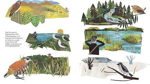 Beautifully illustrated by Clover Robin, the artwork is mixed media painted collage and does a lovely job of enhancing the text. The book is based around the life and early bird counts started by Frank Chapman which grew into the Audubon Christmas bird count.