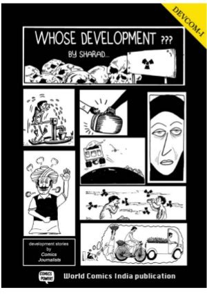 Whose Development (English) and VikaskalheVipreetBuddhi (Hindi) are first comics anthologies on Development recently published by World Comics India. This comics book is also an example of comics journalism at very local level. For last few years World Comics India is actively working to promote the idea. The Grassroots Comics are different from the mainstream comics and drawn by the people themselves. The activists use these comics for communication purposes in their respective organization and area. Over the period of time many of them have picked up the comics as their main profession. There are stories from Jharkhand which tells how the adivasis are being affected because of big development projects and also about the Uranium mines radiation. Story from Assam shows fisherman's harsh life conditions while the Goa story is about big companies’ encroachment into tourism. Kolkata story is about slow moving tram and Rajasthan story is about plight of a Dalit man.