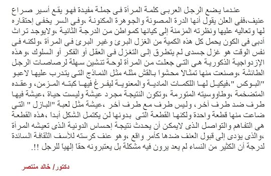 كتاب فى منتهى الأهمية ومنتهى الخطورة ، دراسة واقعية عن العنف الموجه ضد المرأة والتمييز المخجل بينها وبين الرجل فى مجتمعنا الشرقى الذكورى ، حيث يشير فيه الدكتور خالد منتصر لعادات وتقاليد مصرية وعربية خاطئة ، تسبب الكثير من الضرر النفسى والجسدي للمرأة كالختان والعنف ، والكثير من الظلم الواقع عليها نتيجة التمييز بينها وبين الرجل فى مفهوم الشرف وتعدد الزواج ، وغيره من العادات والتقاليد الخاطئة الموروثة فى ثقافتنا العربية والمصرية الشرقية .. كتاب يستحق أكثر من خمس نجمات .. حتى وان اختلفت مع الكاتب فى بعض الأشياء.