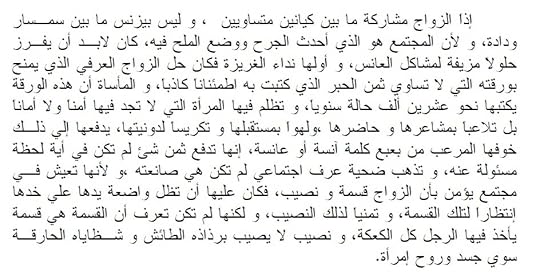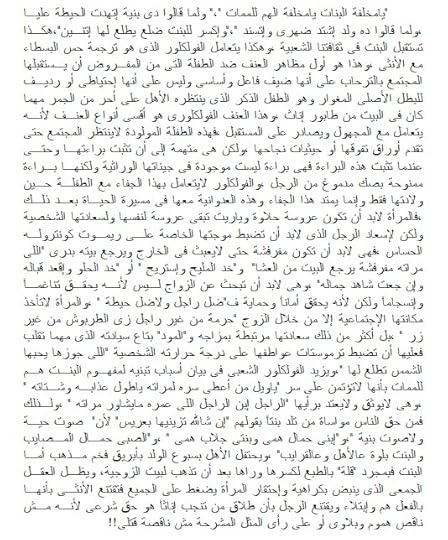 الكتاب قال كل الحاجات اللي نفس أي وحدة متعلمة أو فلاحة أو حرفية أو ربة بيت أو معلمة أو طبيبة أو ...أو ... أو... تقولها من زمان من يوم ما اتولدت و نفسها تغير أي حاجة فيها بس ما بتقدرش لأنها تواجه بسد من التخلف و الهمجية و السيطرة و العنف ما بتقدرش تعبره سباحة إلا أما يجيها وقت و تغرق فيه هي كمان.