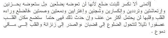 "أتمنى ألا نكسر للبنت ضلع لأنها لن تعوضه بضلعين, بل ستعوضه بحزنين و إرتعاشتين و ترددين و إنكسارين و شجنين و إغترابين و دمعتين و صمتين, فالضلع وراه القلب و قلبها لن يحتمل أكثر من عنف و إن حدث ذلك فهي حتمًا ستضع مكان القلب عصفورًا ذليلًا لتتحول الضلوع إلى قضبان, و الصدر إلى زنزانة و القلب إلى مآقلا دموع."