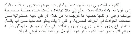 الكتاب صادم و الفصل بتاع جرائم الشرف صدمني لدرجة إني احتجت أسمع السيمفونية الخامسة لبيتهوفن تلات مرات و سيمفونية العرافة لعمر خيرت كمان عشان أفوق و أهدأ..